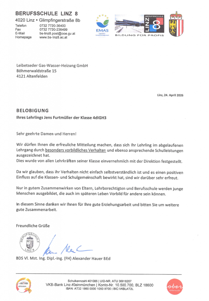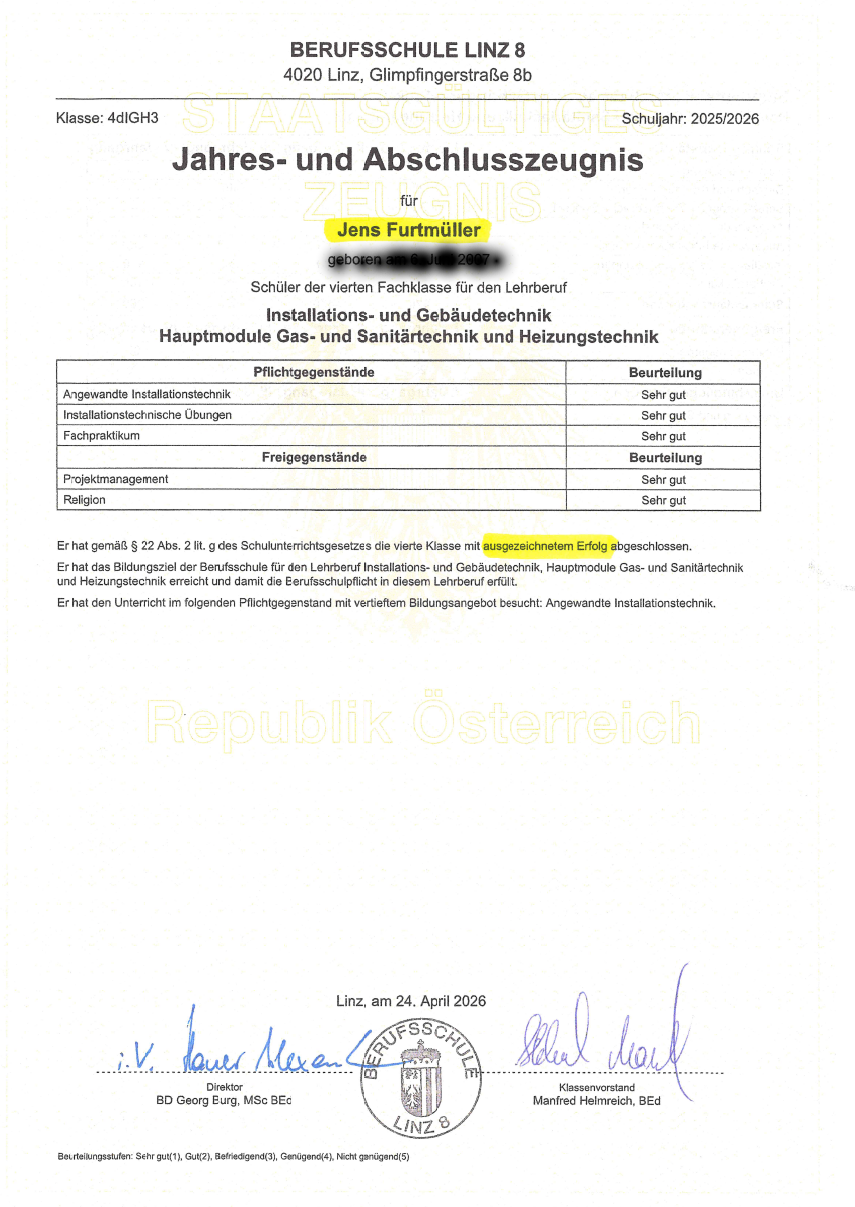 Unser Mitarbeiter Jens Furtmüller hat die 4. Klasse der Berufsschule mit Auszeichnung abgeschlossen – und damit nicht nur fachlich, sondern auch persönlich ein starkes Zeichen gesetzt.