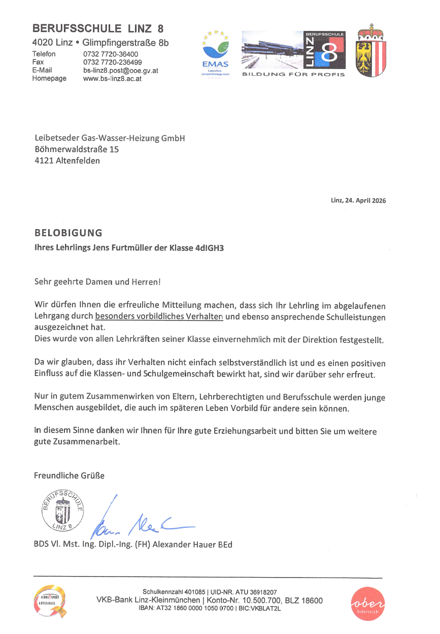 Besonders stolz macht uns, dass Jens zusätzlich von der Berufsschule eine Belobigung für sein vorbildliches Verhalten und seine hervorragenden Leistungen erhalten hat.